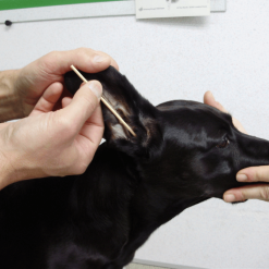 Même sur un grand chien, le diamètre de la portion profonde du conduit auditif (près du tympan) est resserré, si bien qu’ un contact involontaire avec le tympan est virtuellement impossible sur un chien éveillé.