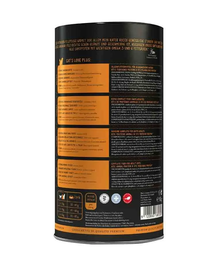 CAT’S LOVE est une alimentation 100% naturelle, en croquettes ou en sachets fraicheur, les menus complets CAT’S LOVE sont composés d’une teneu élevée en viande ou en poisson (71%).