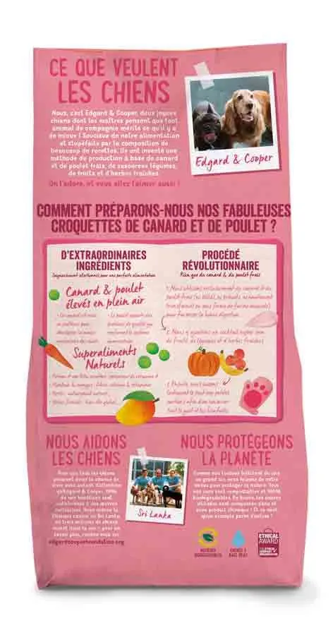 Cette recette simple réunit les nutriments et les saveurs du canard et du poulet avec un mélange délicieux de fruits, de légumes et de fines herbes. Cela veut dire zéro farine animale et pas d’ingrédients transformés ou séchés. Edgard & Cooper cuit lentement les croquettes pour préserver leurs saveurs naturelles, et y ajoute des prébiotiques, de l’huile de poisson et de lin pour augmenter leurs qualités nutritionnelles et faciliter la digestion. Cette recette contient également de la glucosamine et de la chondroïtine, bénéfiques pour la santé des articulations.