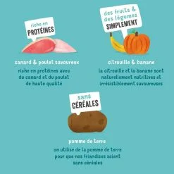 - canard frais élevé en plein air, une excellente source de protéines moins courante, qui aide au développement et au maintien des muscles.