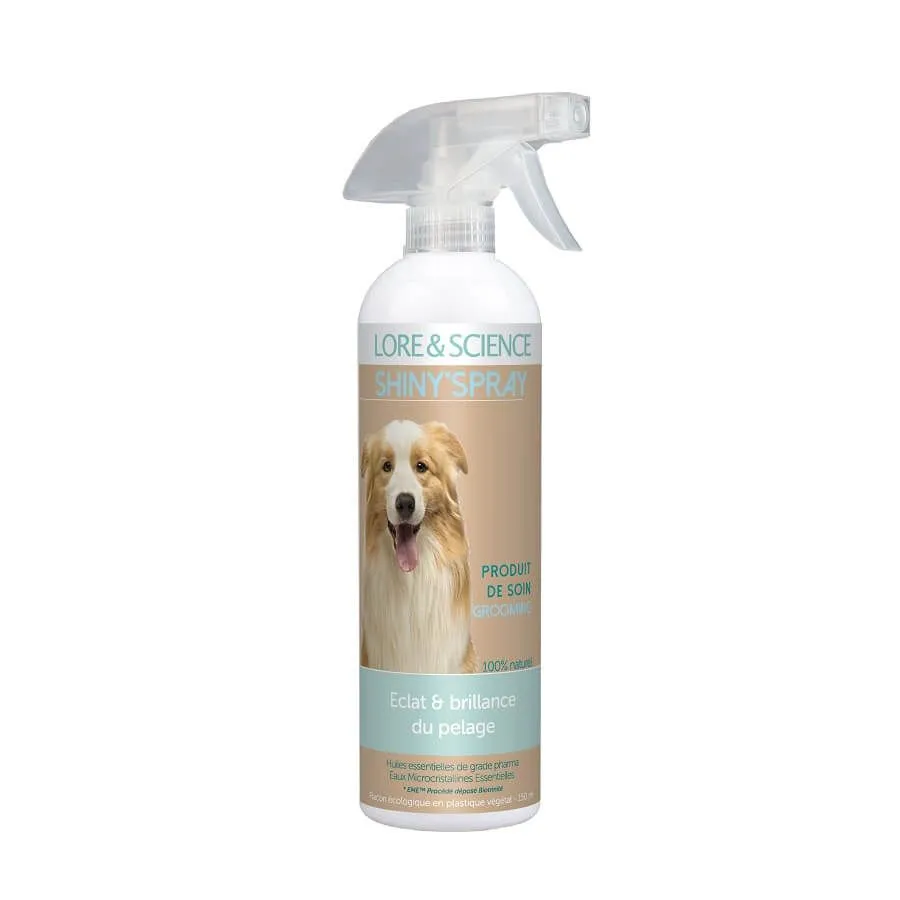 Le Spray Shiny de Lore & Science est un démêlant et lustrant pour chiens.