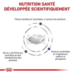 L’association de fibres solubles (psyllium) et insolubles (fibres à fort pouvoir de rétention d’eau) aide à limiter la consommation spontanée de croquettes en augmentant l’intervalle entre les repas, et donc à diminuer l’apport calorique global.