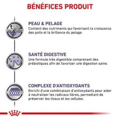 Elle contient des acides gras Oméga-3 & 6, notamment de l’EPA et du DHA, qui vont contribuer à la croissance des poils et à un pelage brillant.